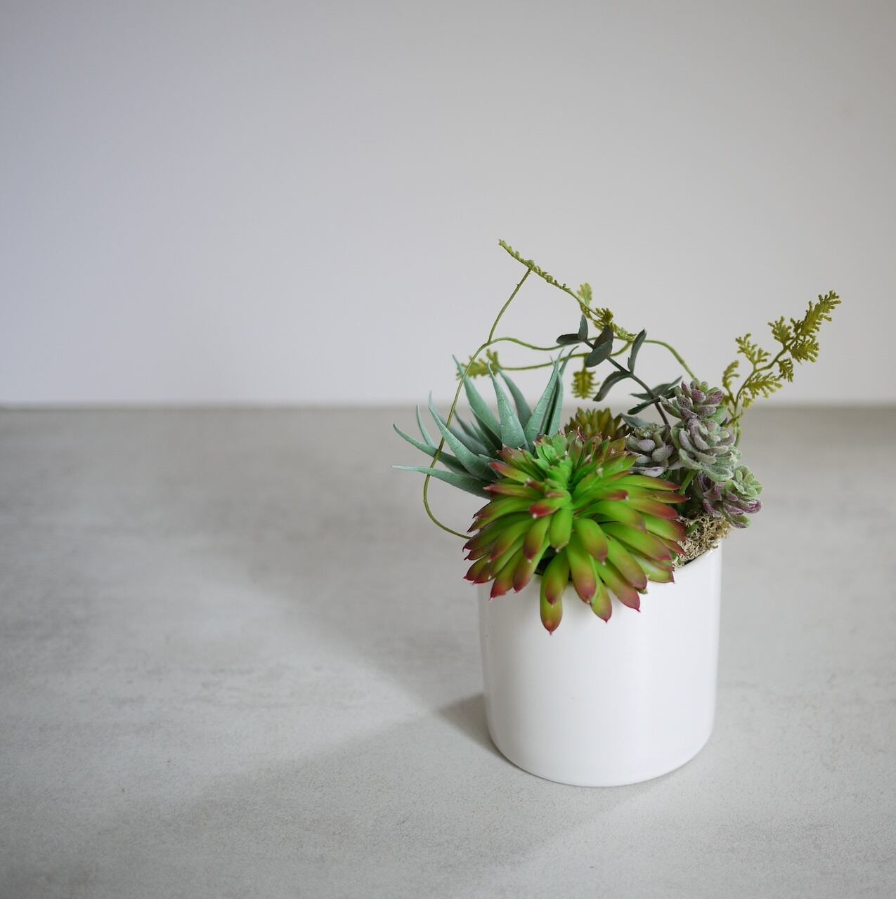 清潔感のある白い円筒形の陶器ポットに、みずみずしい多肉植物たちが寄り添うように配置された、ミニマルでモダンなアレンジメント。 鮮やかなグリーンの色彩が、日常に爽やかな彩りを添えます。 美しい陶器の器に収められた多肉植物は、自宅のリビングはもちろん、オフィスや商業スペースにもぴったり。ギフトとしても喜ばれる逸品です。 【サイズ】約縦15cm 横15cm 高さ20cm 【花材】アーティフィシャルフラワー(バルーンセダム、ブローミーカクタス、ユーカリ、ミニアオエニウム)