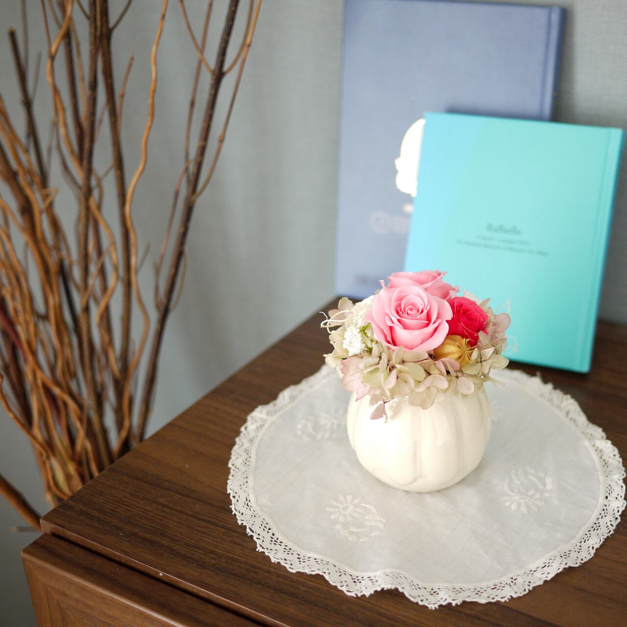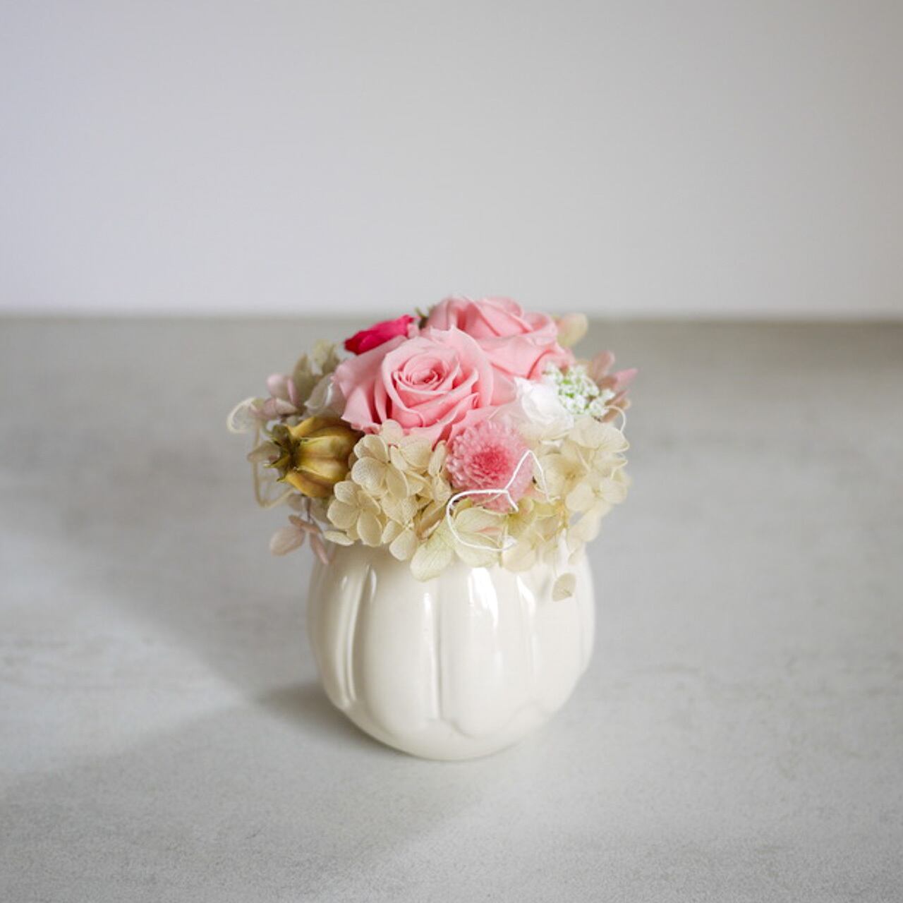スウィートなピンクのプリザーブドローズとアンティーク調のクリームホワイトアジサイを合わせ、コンパクトながら存在感のある仕上がりに