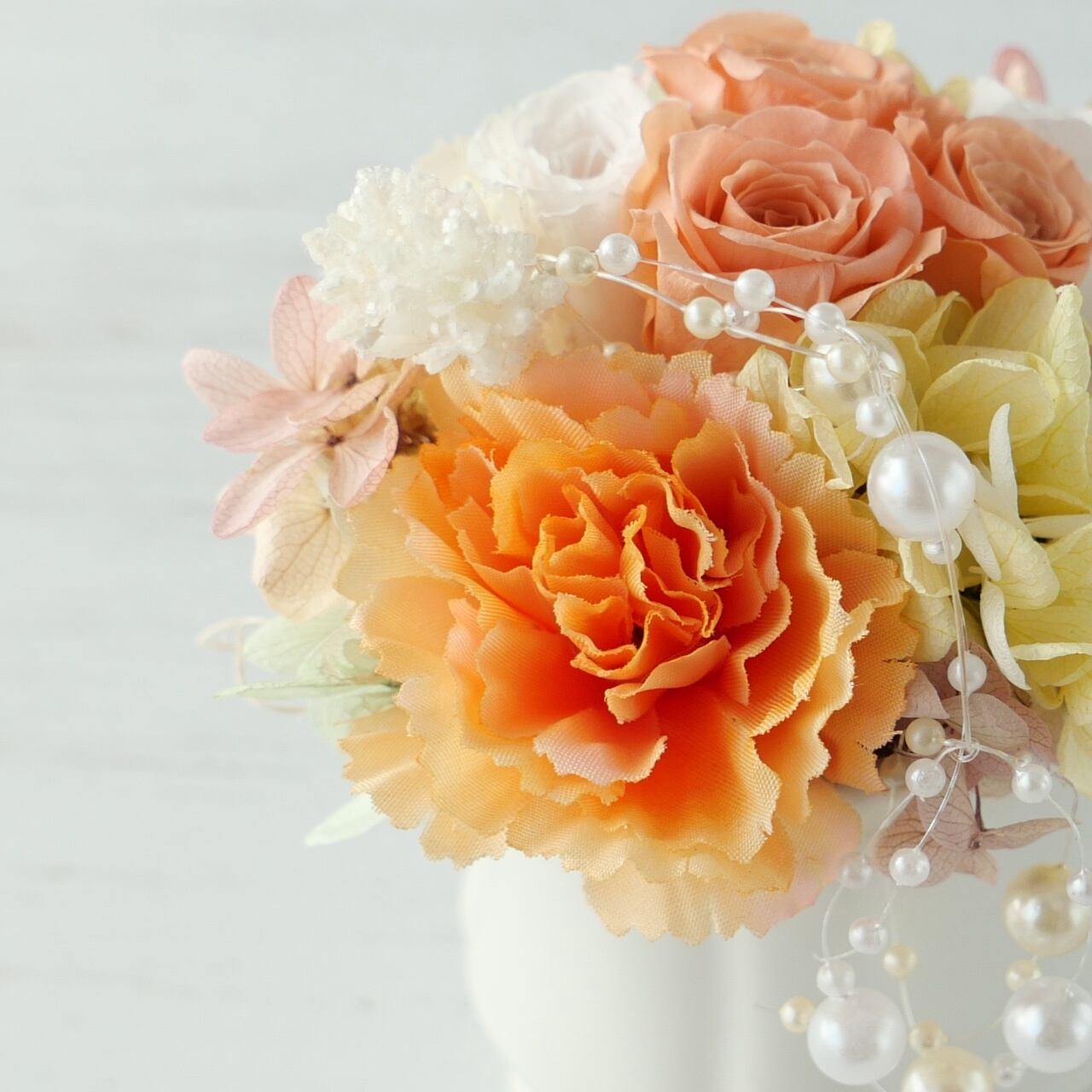 ・花材:プリザーブドフラワー(バラ、アジサイ)、アーティフィシャルフラワー(カーネーション)