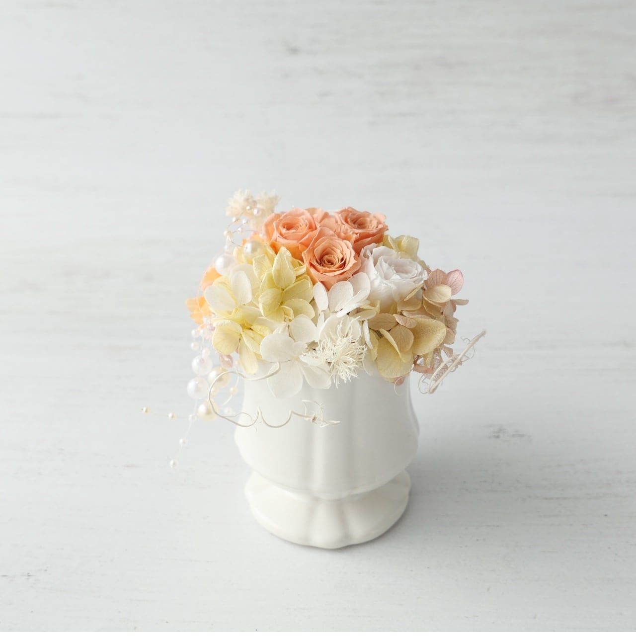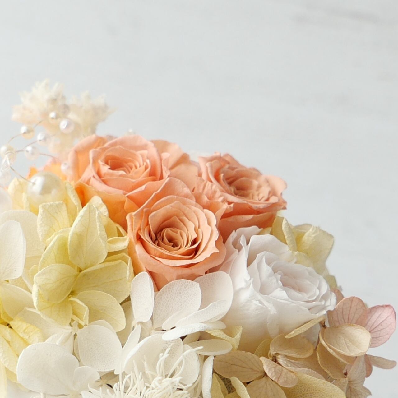 柔らかなピーチオレンジのバラと、クリーム色のあじさいが織りなすのは、まるで春の陽だまりのような温かさ。